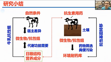 Dr. Liu Jinxin explained three research stories: "The mechanism of the influence of dietary types on the gut microbiota resistance group of calves", "The impact of medication on the gut microbiota resistance group of cows and its environmental transfer", and "The structure of milk resistance groups and key factors affecting microbial resistance".